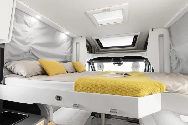 Półzintegrowany Ahorn Camp T 640 to idealny wybór dla osób, które podróżują z dużą ilością sprzętu, a jednocześnie cenią sobie poczucie przestronności. Standardowe elektrycznie opuszczane łóżko nad jadalnią w ciągu dnia chowa się w suficie, zapewniając swobodę ruchu w części mieszkalnej. Uzyskaną w ten sposób przestrzeń wykorzystano na przestronną tylną łazienkę z dodatkowymi szafkami i miejscem do przechowywania. Dla jeszcze większego komfortu snu, model T 640 można opcjonalnie wyposażyć w łóżko w jadalni.
