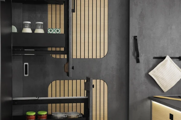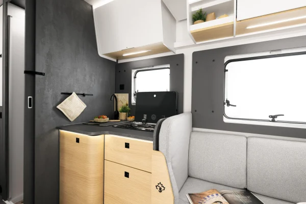 Kuchnia w modelu T 640 została zaprojektowana z myślą o maksymalnej funkcjonalności i nowoczesnym stylu. Praktyczne, wysuwane szafki umożliwiają łatwy dostęp do zapasów i naczyń, zapewniając idealny porządek podczas podróży. Połączenie jasnego drewna z matową czernią tworzy elegancki i przytulny wygląd wnętrza. Każdy detal został dopracowany tak, by codzienne gotowanie w kamperze było wygodne i przyjemne.