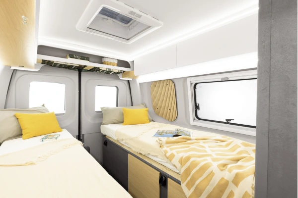 Wnętrze modelu CV 630 zachwyca funkcjonalnością i komfortem. Dwa pojedyncze łóżka w tylnej części pojazdu zapewniają wygodny sen oraz swobodę ruchu podczas wypoczynku. Jasne wykończenia i starannie dobrane materiały nadają wnętrzu przytulny, domowy charakter. Kompaktowe wymiary sprawiają, że kamper pozostaje zwrotny i praktyczny w codziennym użytkowaniu, a nowoczesna kuchnia i pomysłowe schowki umożliwiają wygodne przygotowywanie posiłków w drodze. To idealne połączenie elegancji, komfortu i niezależności w podróży.