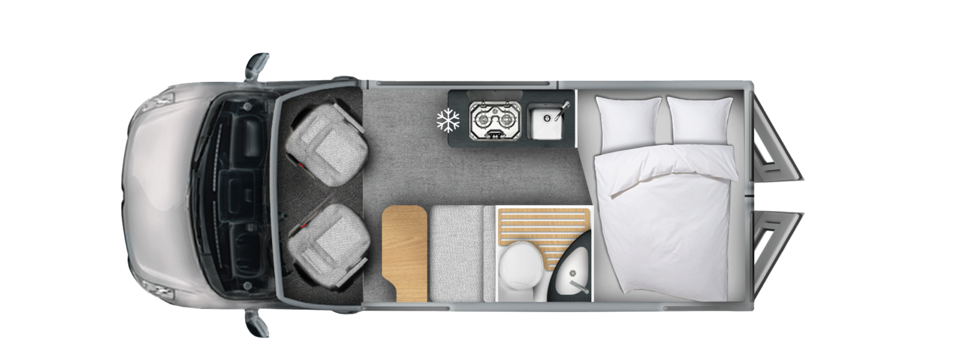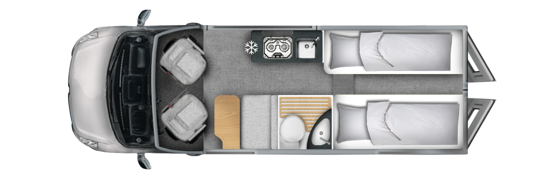 Dzięki dwóm pojedynczym łóżkom z tyłu, kamper CV 630 oferuje dużo komfortu i swobody ruchu – idealny dla spokojnych nocy w podróży. Pomimo kompaktowych wymiarów pozostaje zwrotny i odpowiedni do codziennego użytku, a nowoczesne wyposażenie, wysokiej jakości materiały i przemyślane rozwiązania w zakresie przestrzeni do przechowywania zapewniają prawdziwe poczucie podróży. Niezależnie od tego, czy planujesz weekendowy wypad, czy dłuższą trasę – na pokładzie znajduje się wszystko, czego potrzebujesz, by być niezależnym w drodze: kuchnia, łazienka i wygodna część wypoczynkowa. Na życzenie CV 630 może zostać wyposażony również w dodatkowe łóżko w części jadalnej.