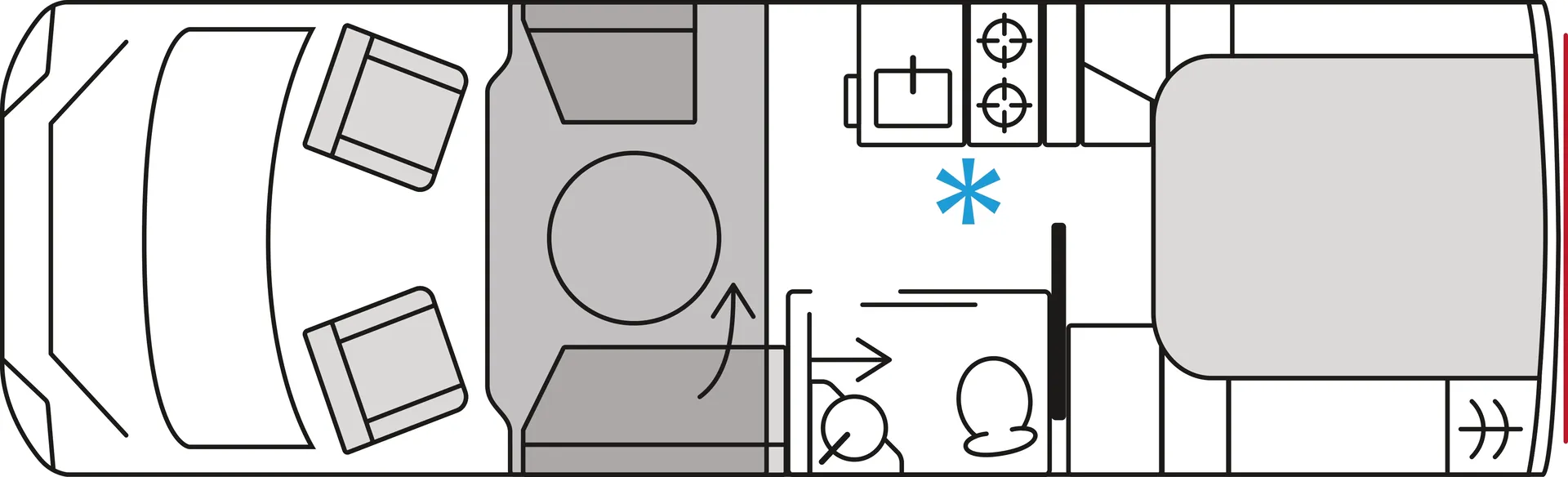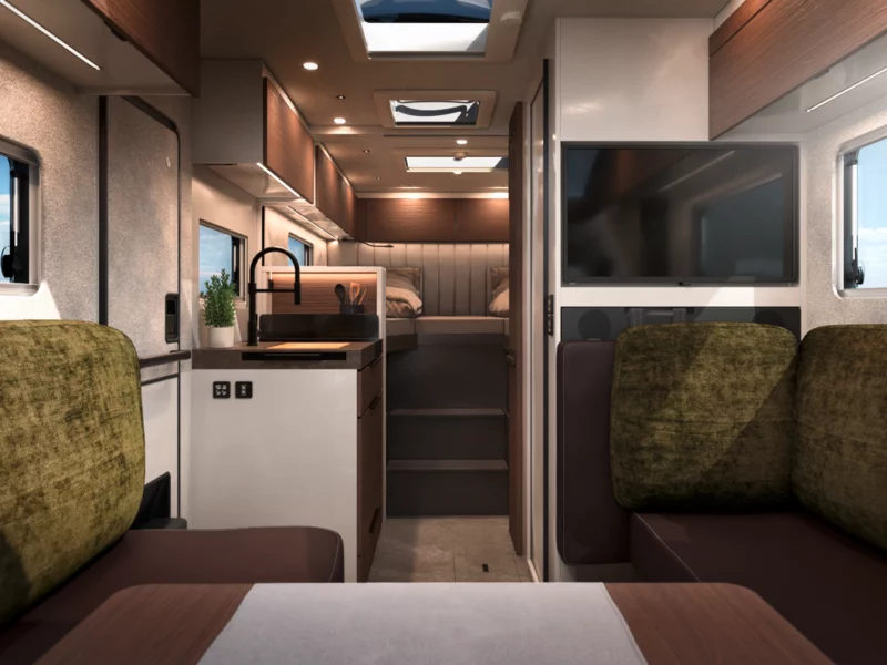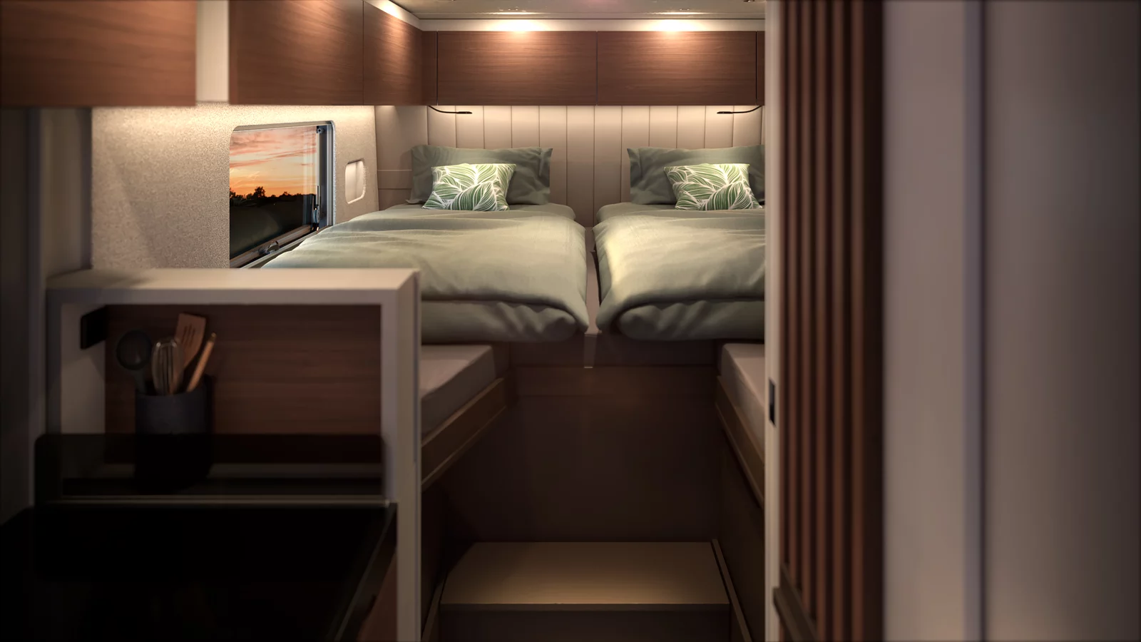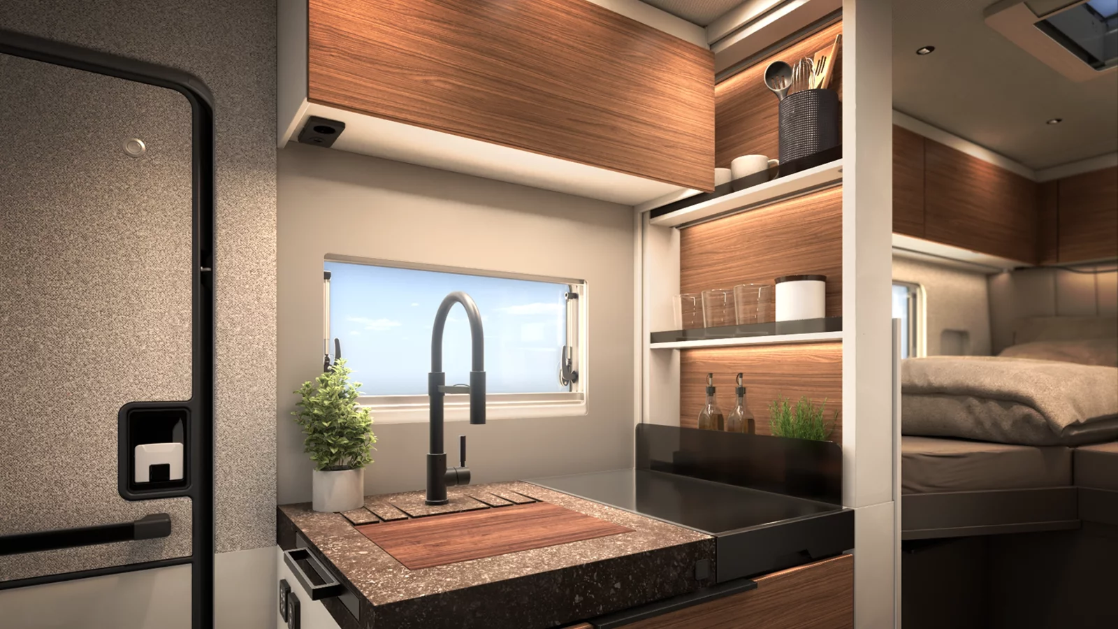 Wnętrze Bürstner Signature zaprojektowano z myślą o wygodzie i estetyce. Jasne, nowoczesne wykończenia tworzą przytulną atmosferę, a praktyczne rozwiązania, takie jak obrotowa ławka czy duży świetlik dachowy, zwiększają funkcjonalność przestrzeni. Kuchnia oferuje wiele udogodnień – wysuwaną półkę roboczą, składany blat i przestronne schowki, które ułatwiają gotowanie w podróży.