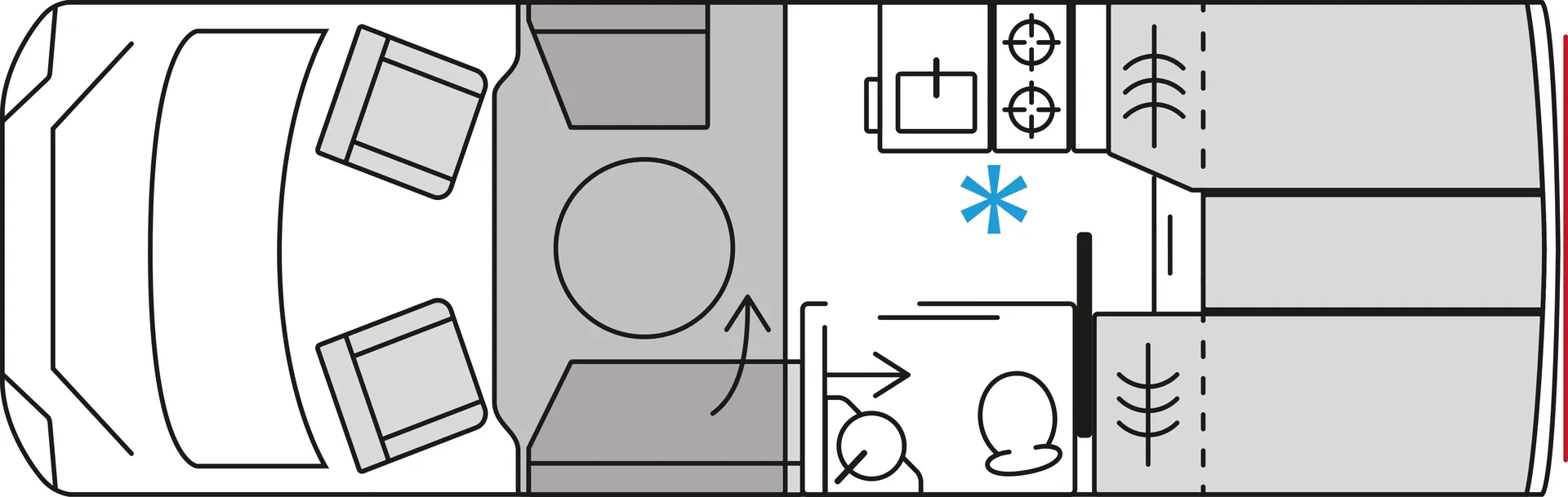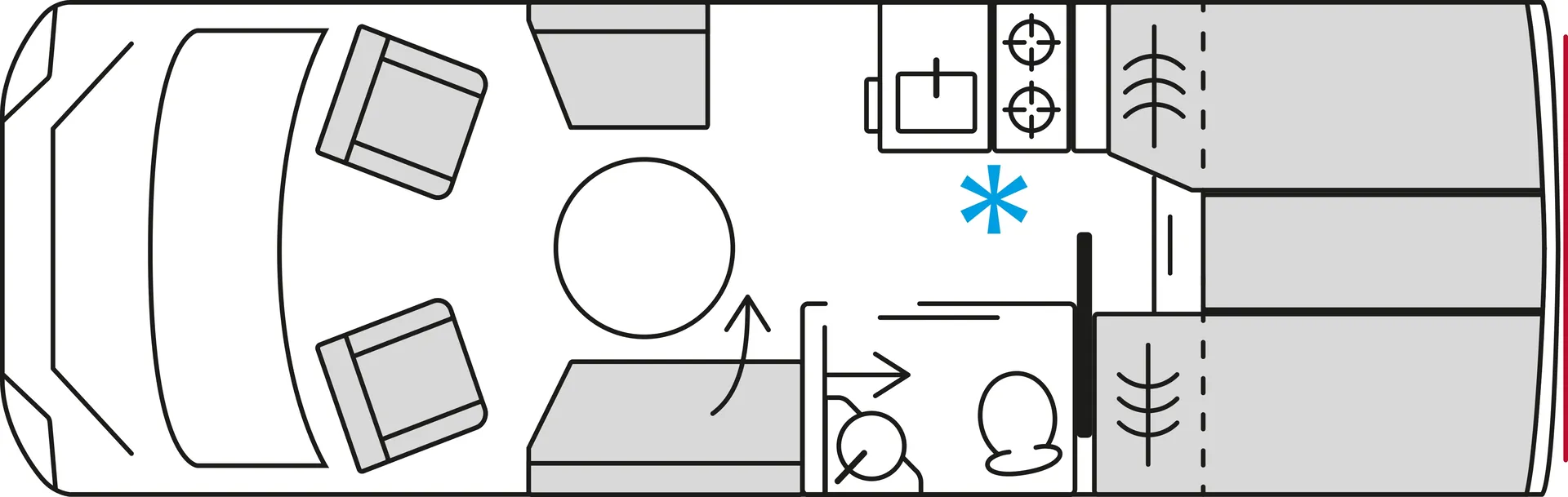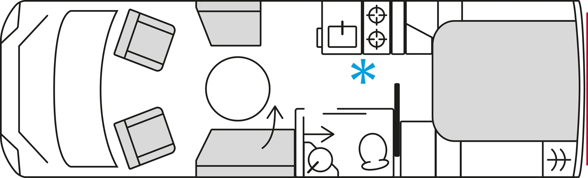 Wnętrze Bürstner Signature zaprojektowano z myślą o wygodzie i estetyce. Jasne, nowoczesne wykończenia tworzą przytulną atmosferę, a praktyczne rozwiązania, takie jak obrotowa ławka czy duży świetlik dachowy, zwiększają funkcjonalność przestrzeni. Kuchnia oferuje wiele udogodnień – wysuwaną półkę roboczą, składany blat i przestronne schowki, które ułatwiają gotowanie w podróży.