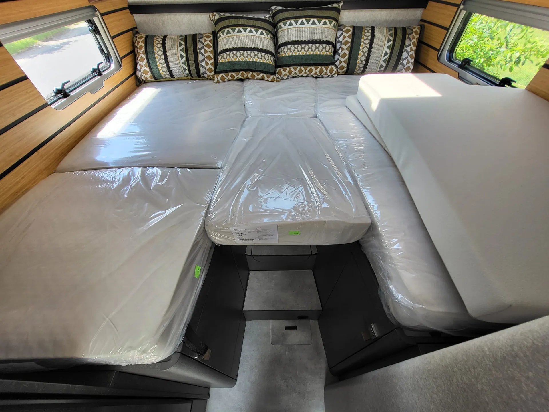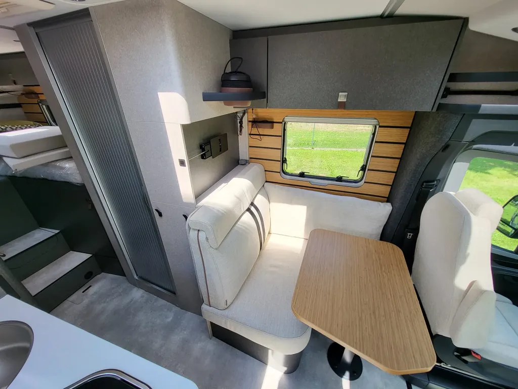 Przebudowa łóżka na grupę siedzeń w kształcie litery L z opuszczanym stołem
