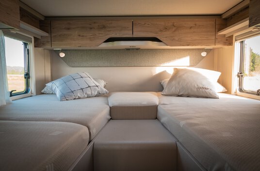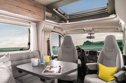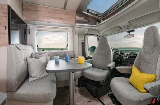 Dzięki wszystkim wymienionym funkcjom zapewniającym komfort, nowy HYMER Exsis-i oferuje również wspaniałe, obszerne poczucie przestrzeni, które zapewnia zintegrowany kamper, włączając kabinę kierowcy w części mieszkalnej.