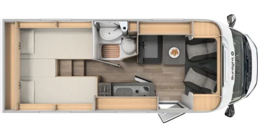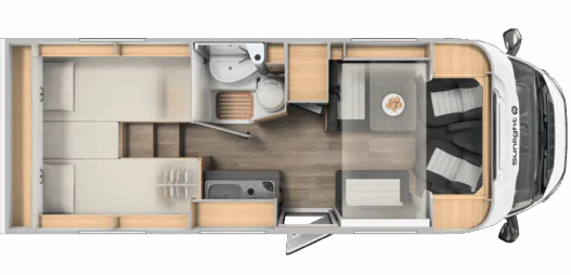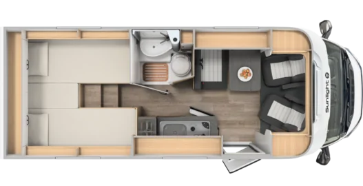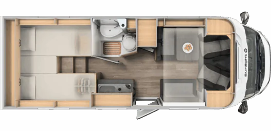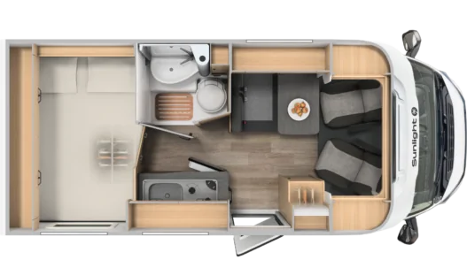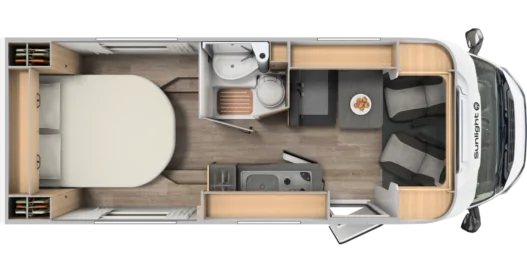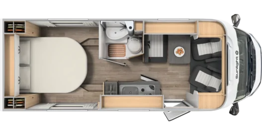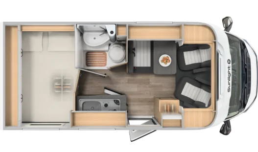 Kampery Sunlight Van mają ergonomiczne siedzenia pasażerskie, które w czasie postoju pełnią funkcję komfortowej kanapy. Rozkładany stół pozwala na wygodne spożywanie posiłku, pracę lub granie w gry planszowe.