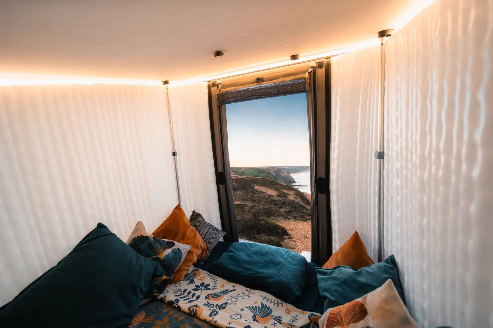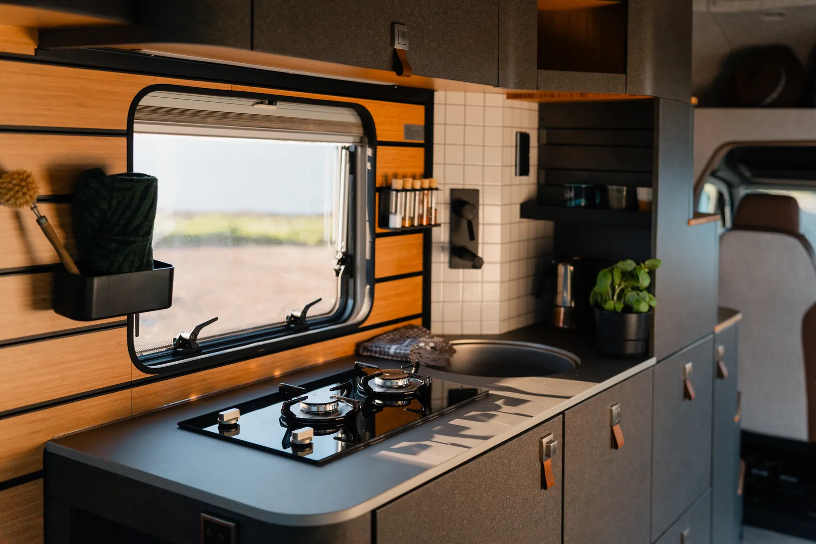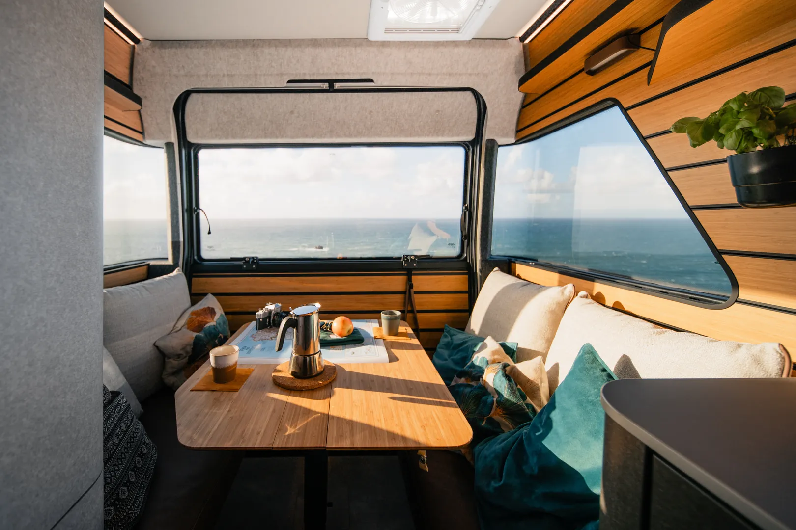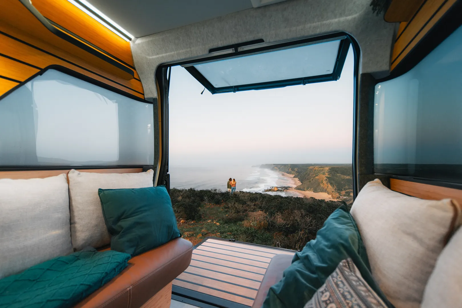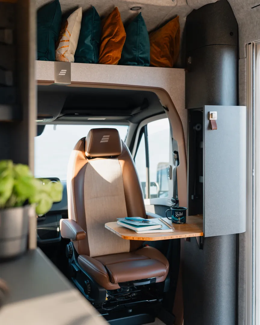 Wbudowany kompresor odpowiada nie tylko za automatyczne podnoszenie dachu. Dzięki niemu również odpowiednio dobierzesz i spersonalizujesz twardość materaca w górnej sypialni. Wszystkie urządzenia znajdujące się na pokładzie kampera mogą być sterowane za pomocą aplikacji w smartfonie z dowolnego miejsca na ziemi.
